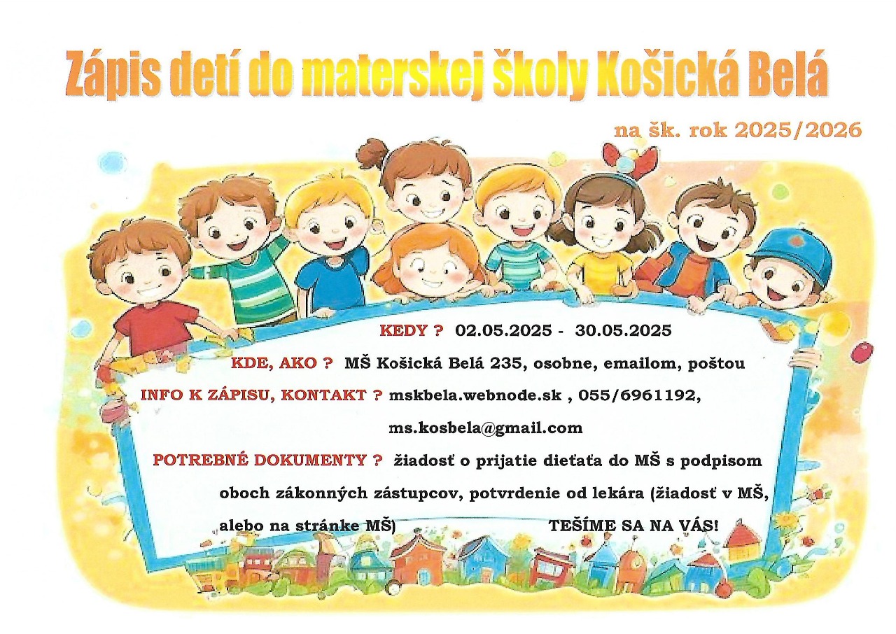 Oznamujeme zákonným zástupcom, že prijímanie detí do materskej školy Košická Belá na školský rok 2025/2026 je od 02.05.2025 do 30.05.2025.